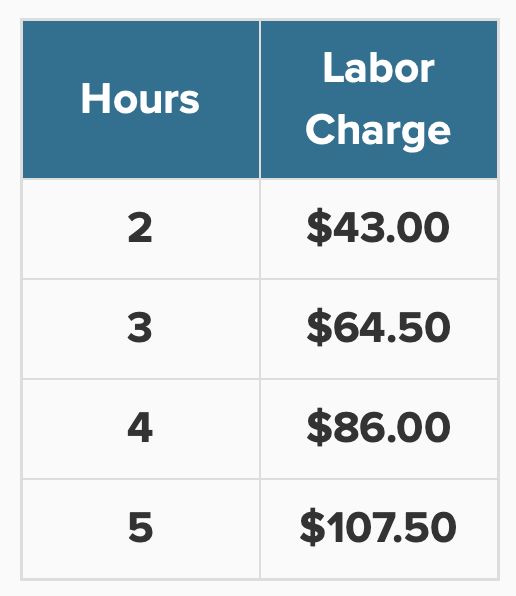 An electrician charges his customers an hourly rate for labor, as shown in the table. In addition to the hourly rate, customers are also charged for the cost of materials needed to complete the job. If Mrs. Hammons (the customer) will be charged for 6 hours and $70 for materials, what is her total charge?