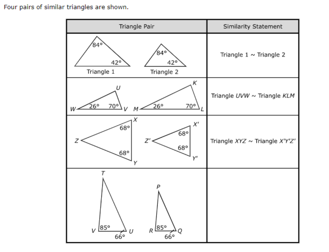 8.8D Use informal arguments to establish facts about the angle sum and exterior angle of triangles, the angles created when parallel lines are cut by a transversal, and the angleāangle criterion for similarity of triangles.