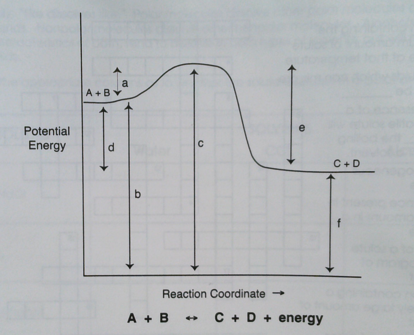 What letter represents the potential energy of the reactants in the forward reaction?