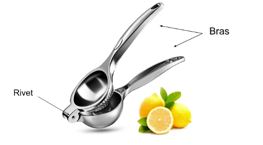 Identifiez les quatre caractéristiques de la liaison entre les deux bras du presse citron et justifiez vos choix.