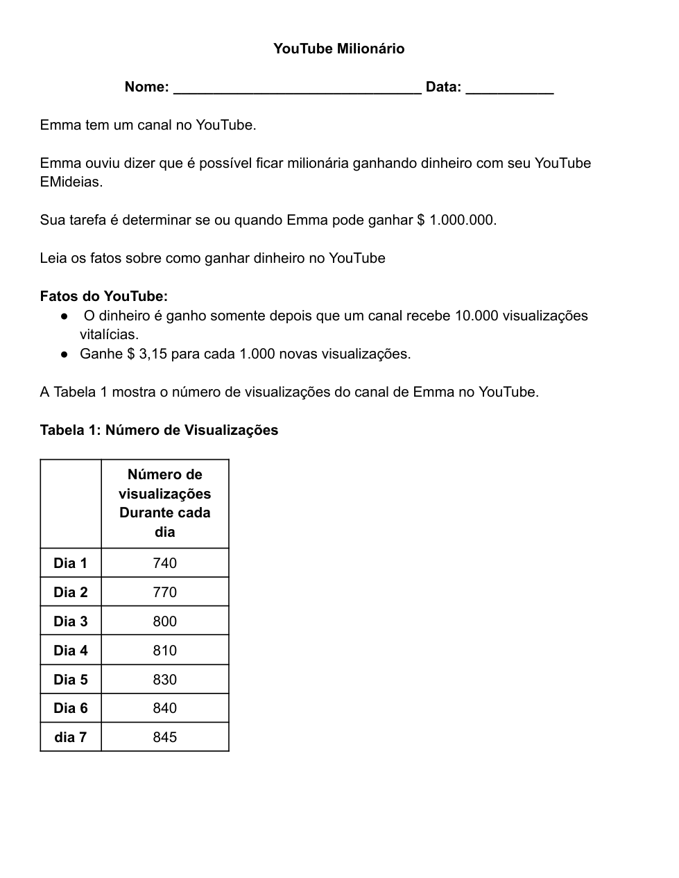 Depois que o canal do YouTube de Emma alcançar 10.000 visualizações ao longo da vida, determine a quantia de dinheiro que Emma ganhará por 5.000 novas visualizações.