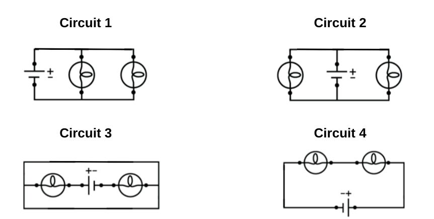 Les circuits ci-dessous présentent des circuits dans lesquels deux ampoules sont branchées à une source.