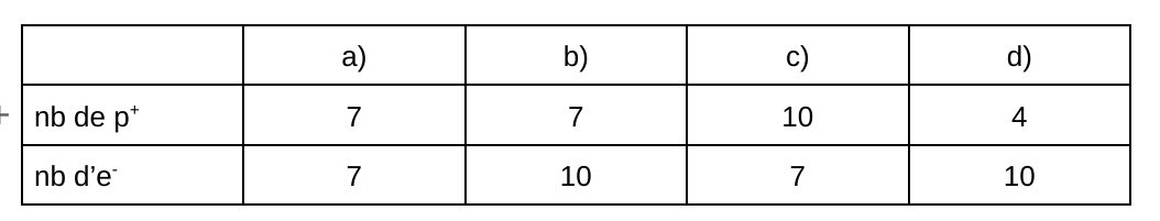 Parmi les colonnes suivantes, laquelle représente correctement l’ion N3-