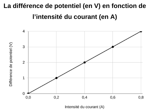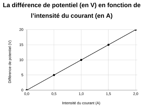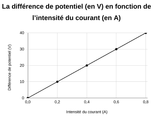 Les graphiques ci-dessous représentent des données obtenues en laboratoire à l’aide d’un multimètre. Déterminez lequel de ces graphiques de la loi d’Ohm représente le mieux une résistance de 50 Ω ?