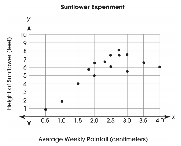 A scientist is studying the effect of rainfall on the height of a certain species of sunflower. The scatter plot shows the results. What conclusion does the data support?