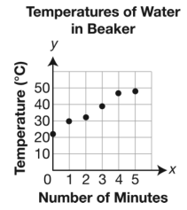 Marcie heated a beaker of water in science class. The scatter plot below shows the temperature (y), in degrees Celsius, of the water based on the number of minutes (x) she heated the water.