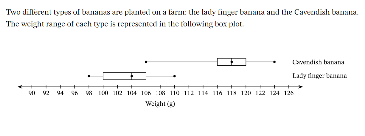 Two different types of bananas are planted on a farm: the lady finger banana and the Cavendish banana. The weight range of each type is represented in the following box plot. What are the medians for the lady finger banana and Cavendish banana respectively?