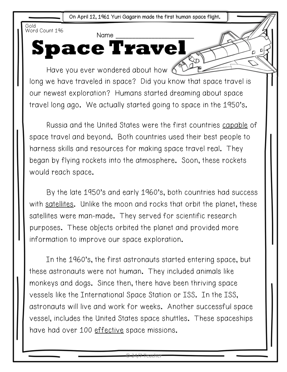 Space Travel- Reading Comprehension