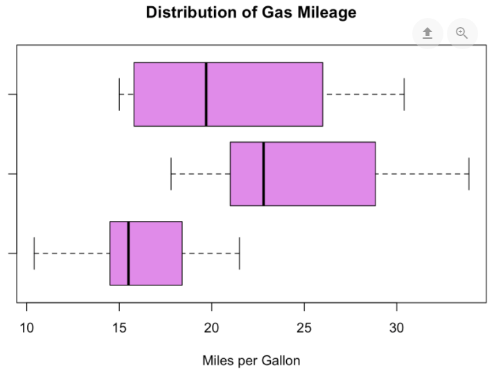Below are the box plots recording the gas mileage of three cars over the course of one week. Use the box plots to help you answer the following questions.