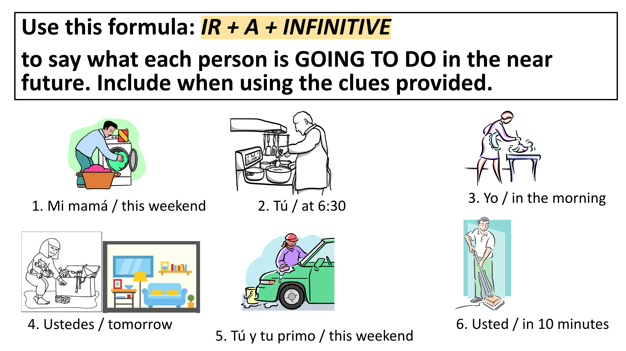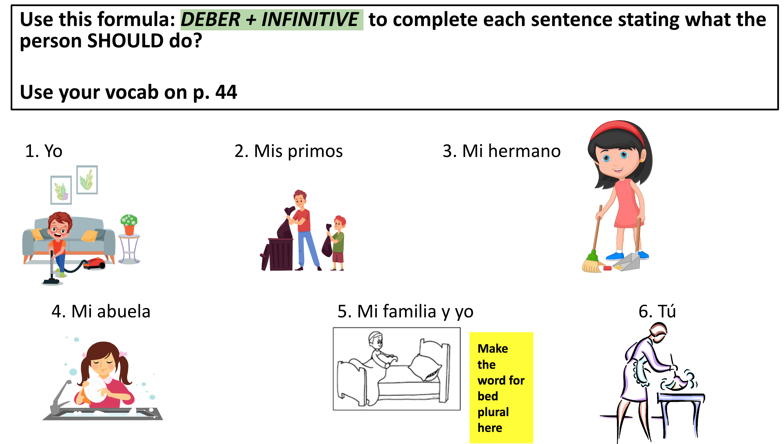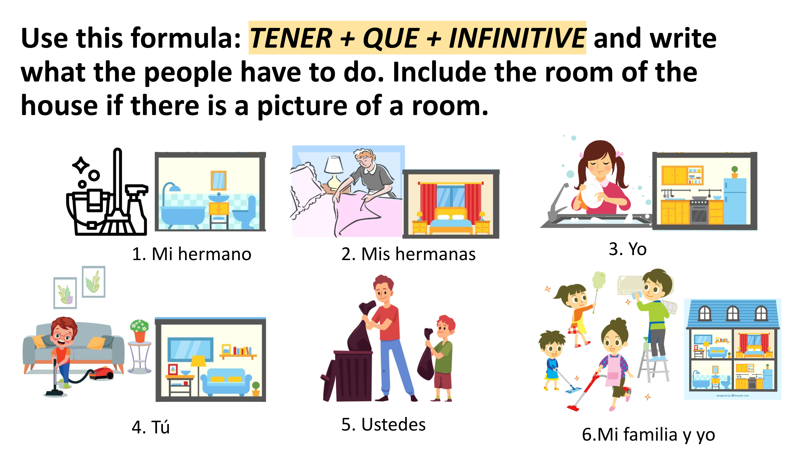Use the HAY que + Infinitive formula to create sentences stating what MUST BE DONE based on each picture.
