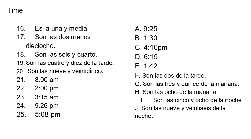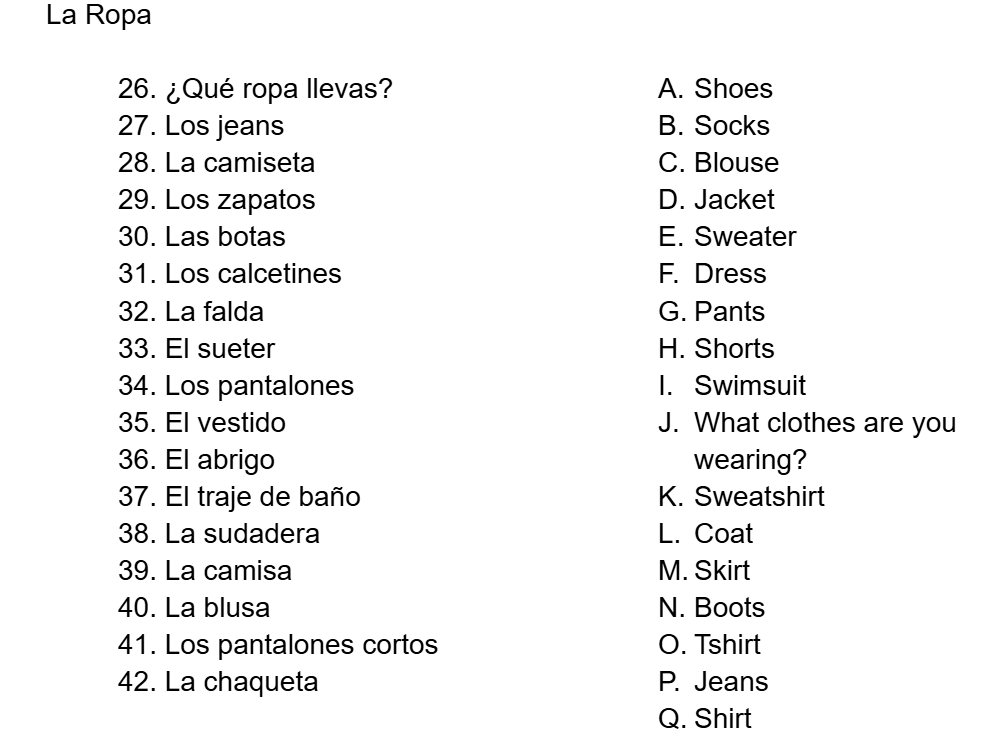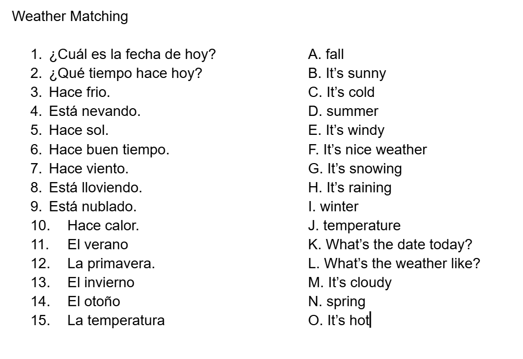 Spanish 6th grade Weather & Time & Dates & Clothes quiz