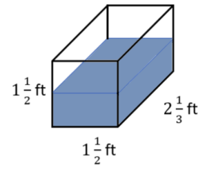A tank that measures 1½ feet across, 2⅓ feet wide, and 1½ feet tall, is filled halfway with water, as shown below. To fill the tank to the very top with water, how many cubic feet of water need to be added? (do not round!)