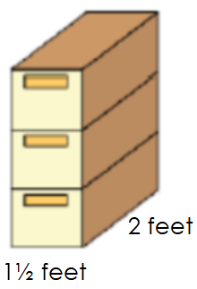 Leo needs storage boxes to ship his bread. He has a stack of 3 identical boxes, like the ones in the drawing. The height of each box is 11/4 feet. What is the volume of the stack of 3 storage boxes?