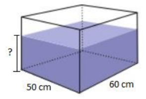 A rectangular tank is 50 cm wide and 60 cm long. It can hold up to 126 liters of water when full. If Amy fills 2/3 of the tank as shown, find the height of the water in centimeters. (Recall that 1 liter = 1,000 cm3)