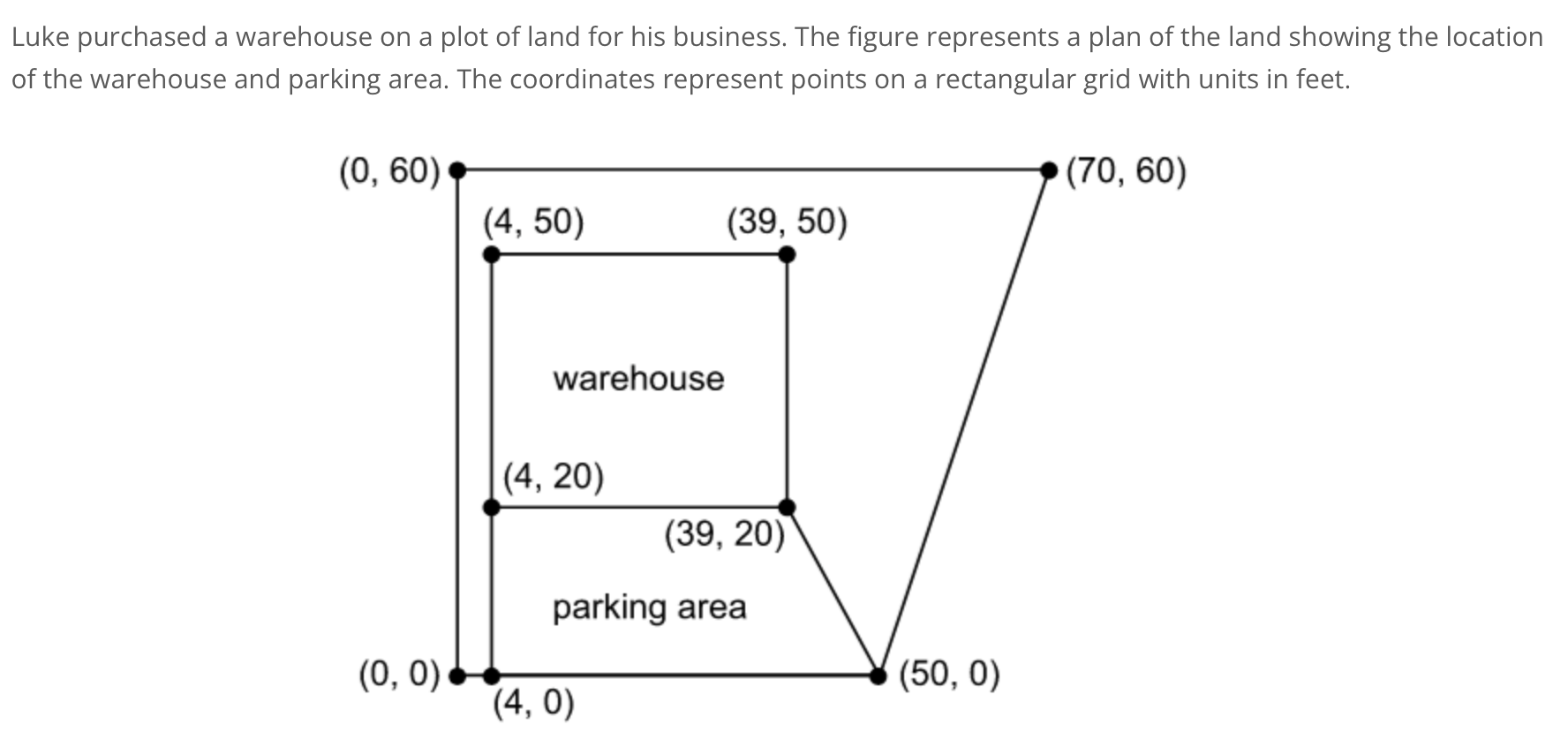 Three coordinates of a rectangular city block are (5,4), (10,4), and (10,10) on a coordinate plane.