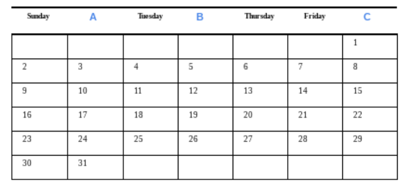 Using the calendar above, what day of the week is letter C?