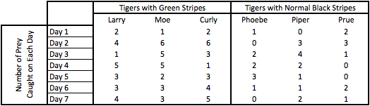 Which statement of reasoning best connects the following claim and evidence?:Claim: Green stripes help tigers catch more prey.Evidence: Phoebe, Piper, and Prue caught less than half of the amount of prey Larry, Moe, and Curly caught.