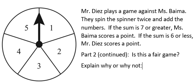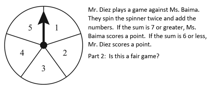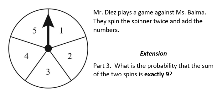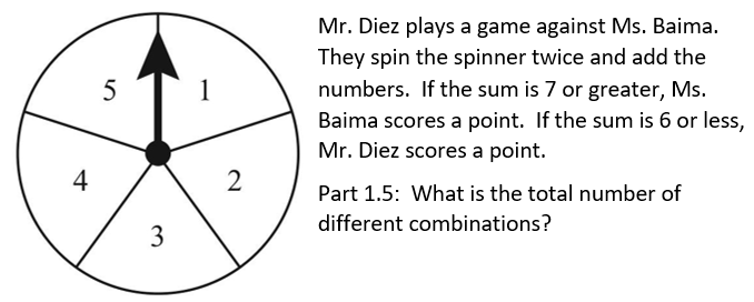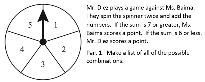 Carlene rolls two dice. Here is a tree diagram of her possible outcomes. What is the probability that the sum of the rolls are going to be greater than 5 but less than 9?