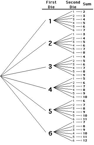 Carlene rolls two dice. Here is a tree diagram of her possible outcomes. What is the probability that the sum of the rolls are going to be 12?