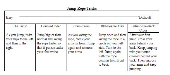 The chart gives information about several jump rope tricks. In which trick would your arms be crossed in front? (ELA 4.6.3 and 4.6.13)