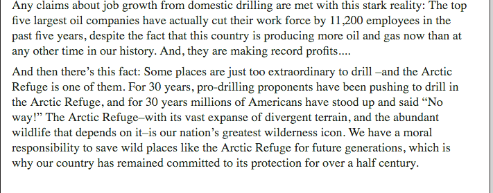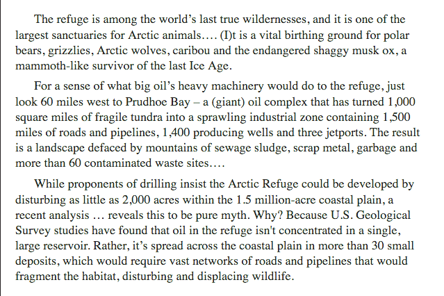 1. According to the document, what are three crises this country faces?2. Would domestic drilling create job growth? Why or why not?3. What does the author mean when she says that “some places are just too extraordinary to drill?” 4. What do you think is the best counter-argument against this editorial essay?