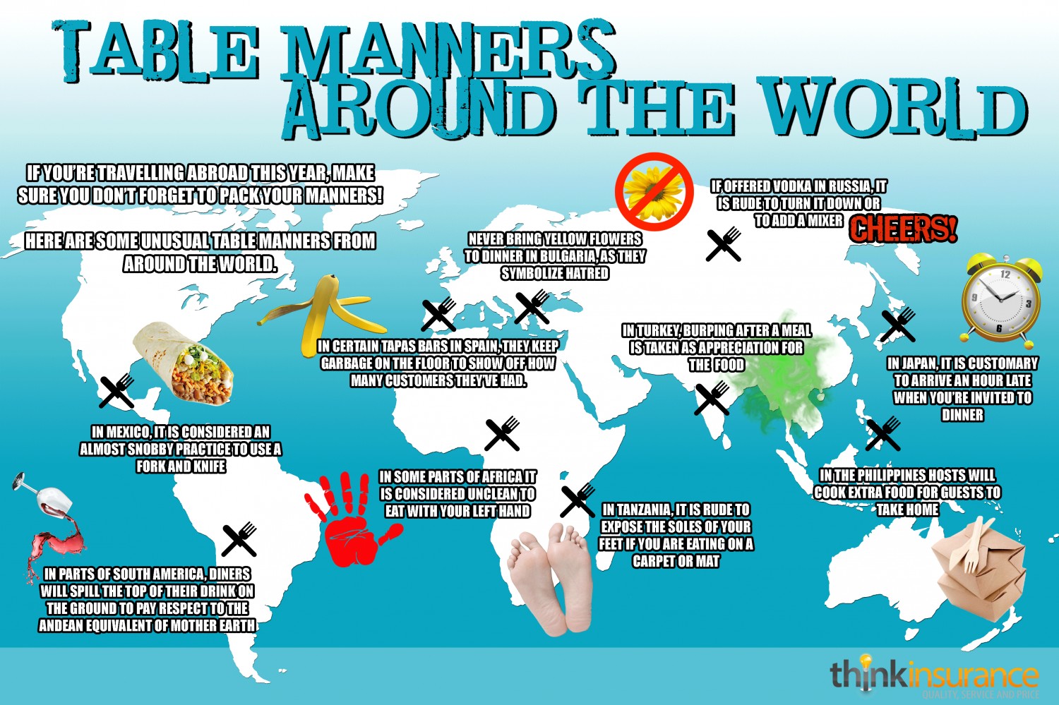 If you’re any sort of mister manners when it comes to dining etiquette, you know the basics of American restaurant behavior. Splitting the check – usually OK. Letting out an impressive burp at a fine dining establishment – not so much. These unspoken rules are pretty clear-cut. However, things get tricky when you’re traveling to other countries, as the do's and don't of table manners begin to change.This helpful infographic shows curious eaters through etiquette around the world. Let’s say you’re at a restaurant in Japan and you’ve got a tiny bit of sticky rice left on your chopsticks. Whatever you do -- don't lick the chopstick. It’s rude, man! Dining out with a group of friends? In this situation, splitting a check would be considered terrible etiquette, same goes for China and France. Check the infographic below for more information!