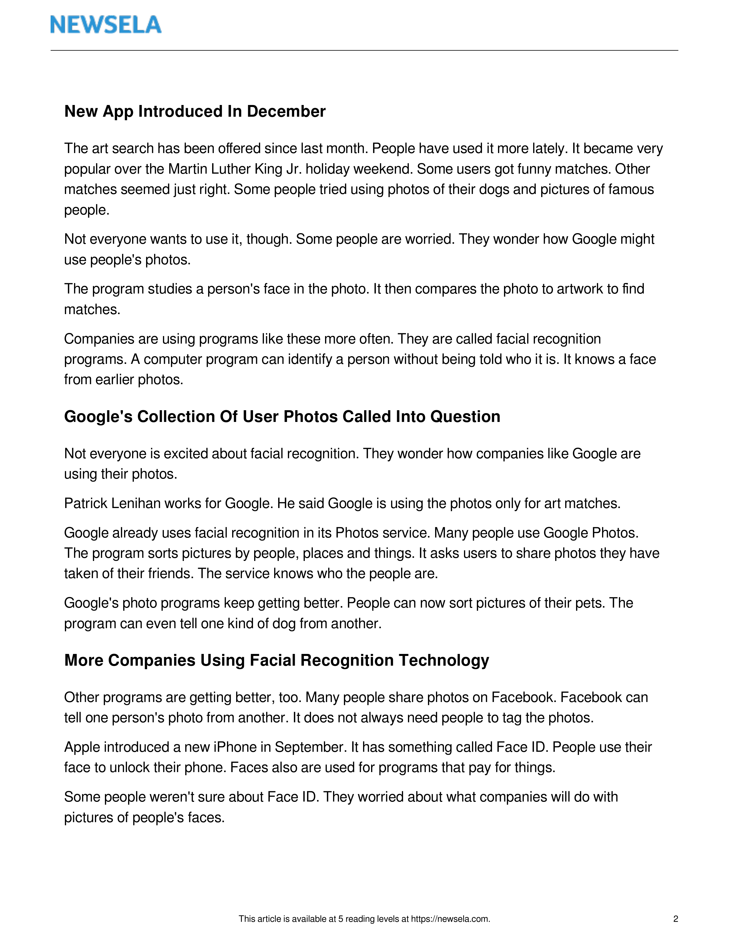 Companies are using programs like these more often. They are calledfacial recognition programs. A computer program can identify a personwithout being told who it is. It knows a face from earlier photos.