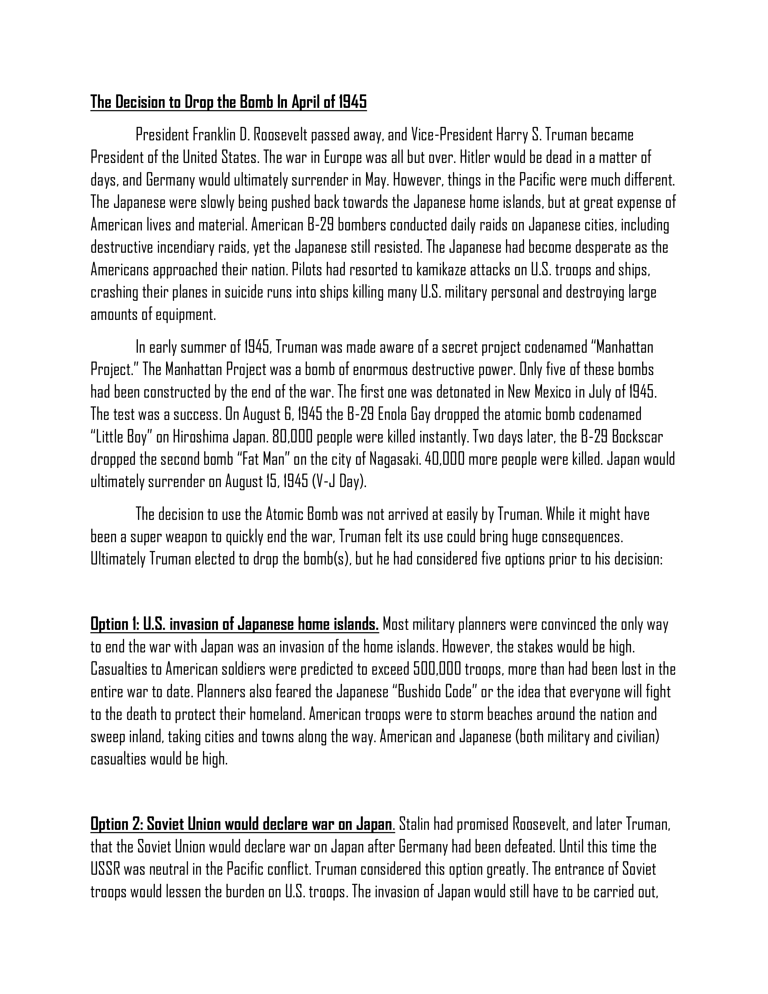 Overall, is using the bomb to force an immediate end to the war a positive or negative option? Why?