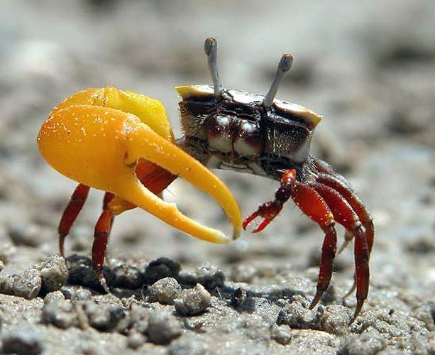 Above is a picture of a fiddler crab. What do you observe about its claws?