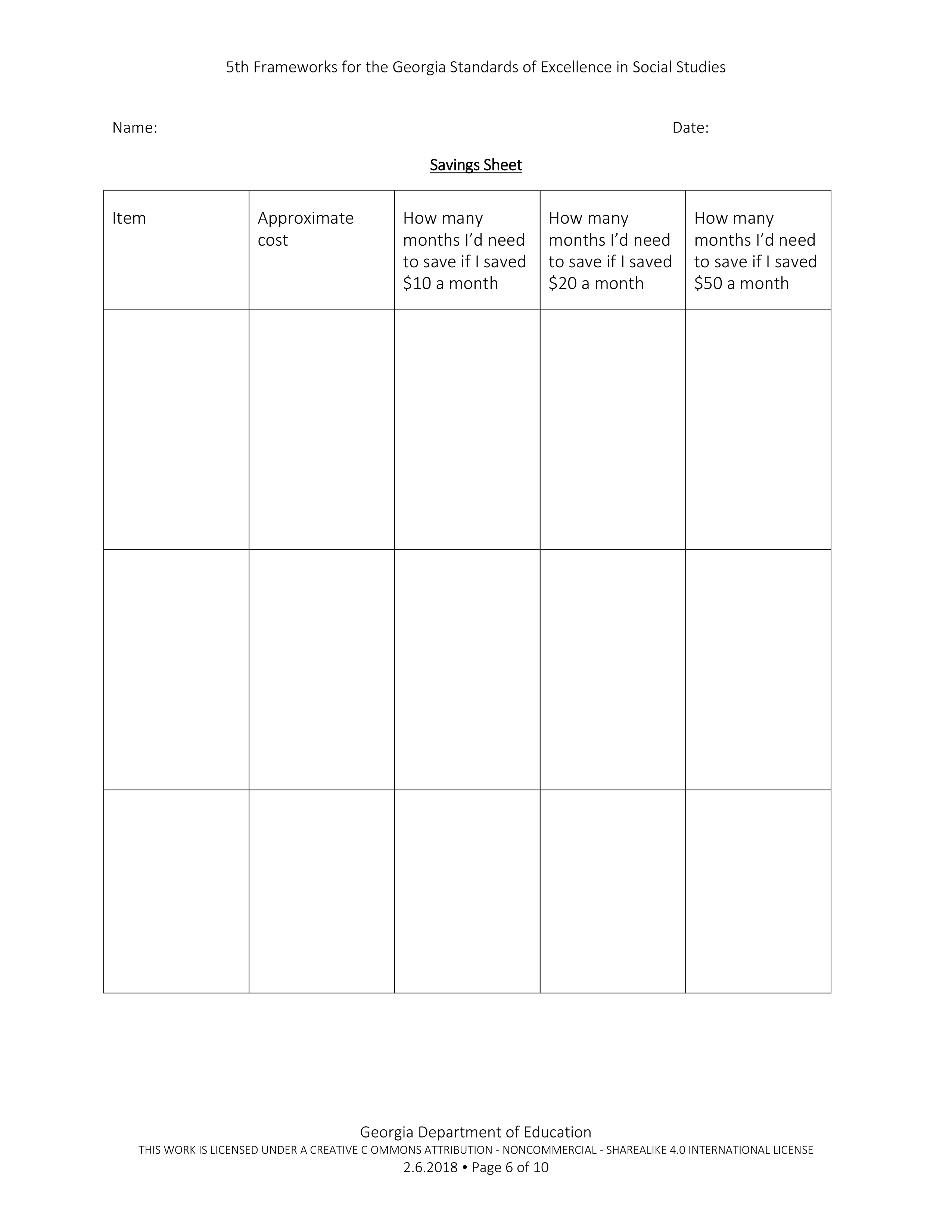 Fill out the attached “Saving my money sheet” to see how much money you would need to save to buy the various things you may want to purchase.