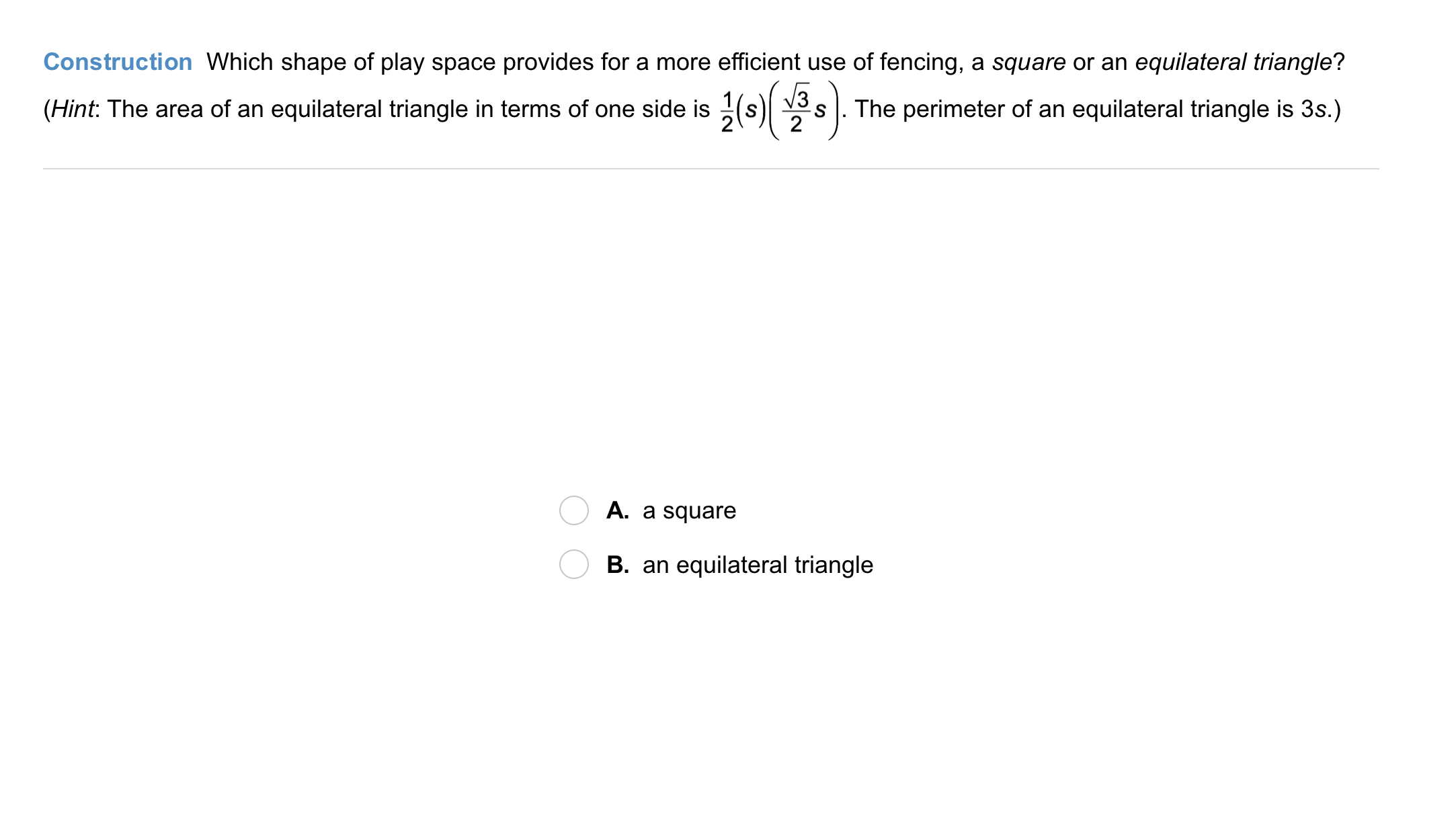 Problem 4 Got It?Construction: Which shape of play space provides for a more efficient use of fencing, a square or an equilateral triangle?