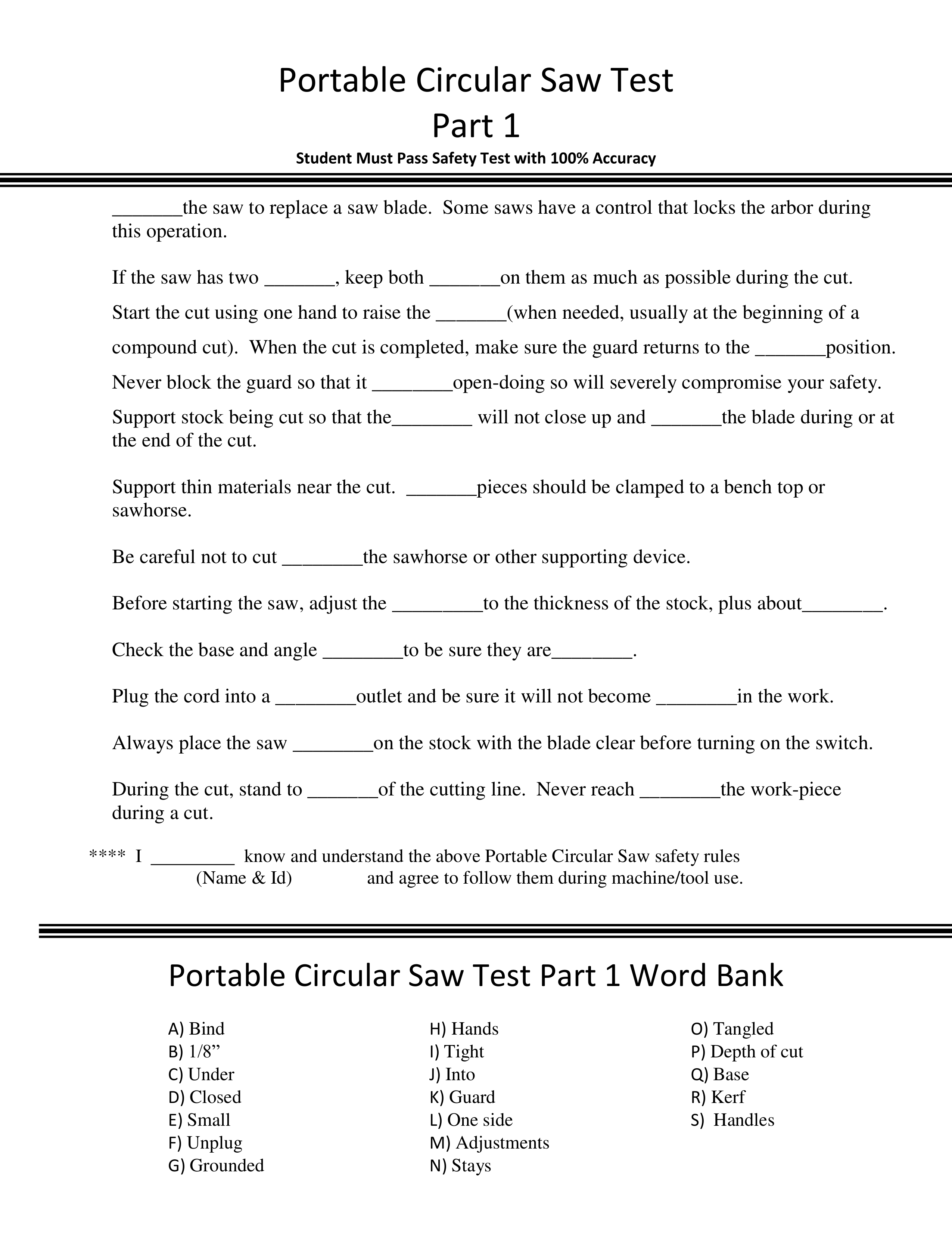 Type your first & last name AND Student Id in the answer box. By doing so you agree that you know & understand the Portable Circular Saw Part 1 safety rules and agree to follow them during machine use. MUST ANSWER OR TEST IS VOIDED.