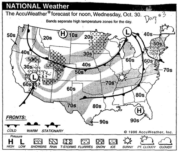 The southern coastal area of the USA has a cold front moving in. With this front, what type of weather will form eventually? (remember from the video)