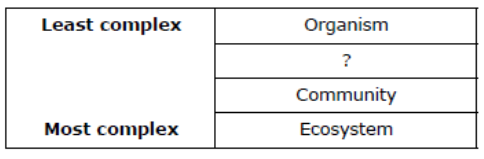 The table above lists levels of organization in an ecosystem from least complex to most complex. Which of the following belongs in the table where the question mark is?