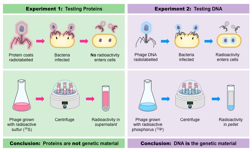 Video clips and written text about how scientists figured out that the genetic material was DNA instead of proteins.