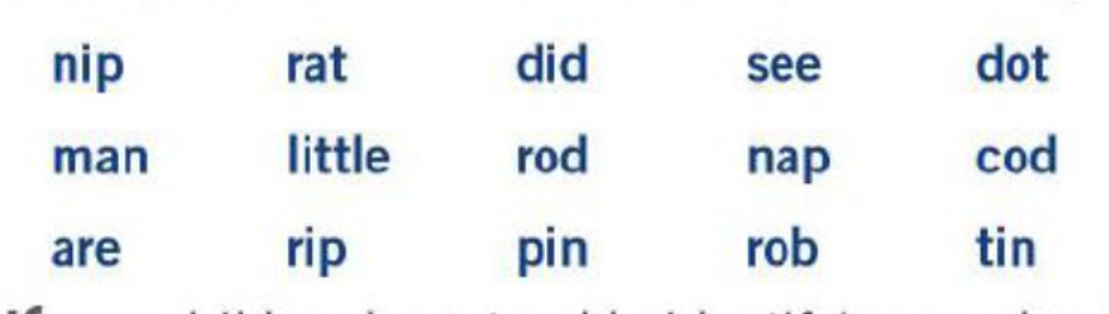 Write 3 words that have the same vowel sound as nip. Read them out loud at the end. Choose from the words in the picture.