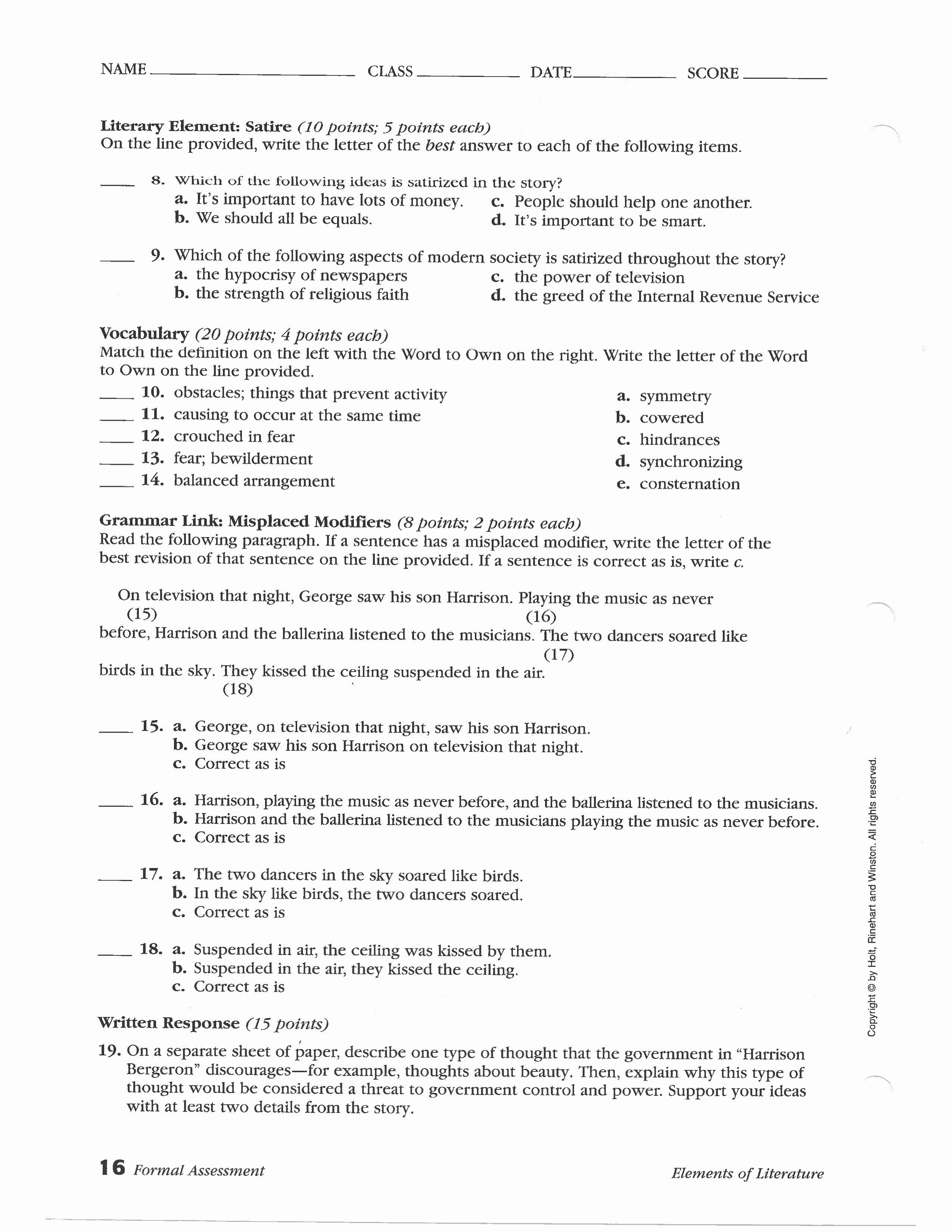 "Harrison Bergeron" Formative Assessment by Kurt Vonnegut