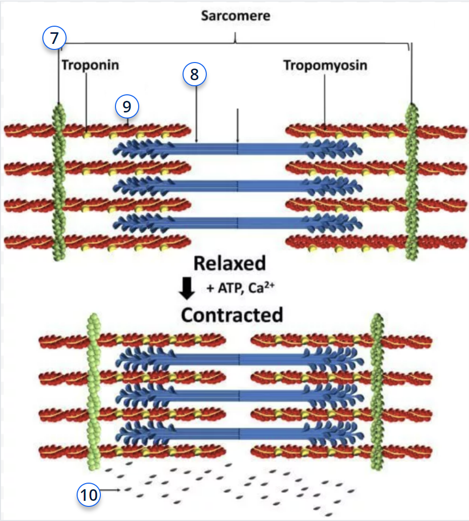 After the cross-bridge forms, the myosin head rotates towards the center of the sarcomere. As it rotates, the myosin releases its ADP and phosphate.