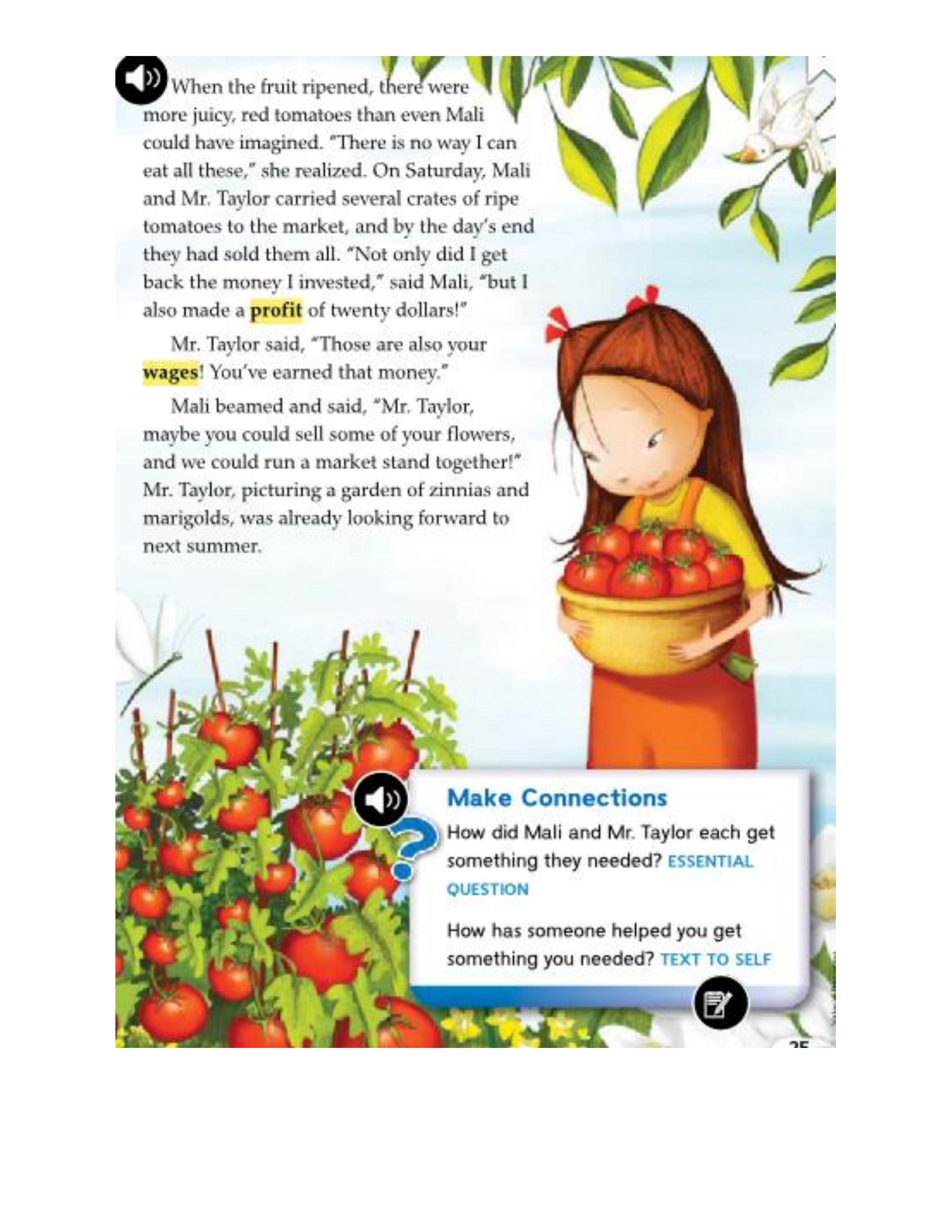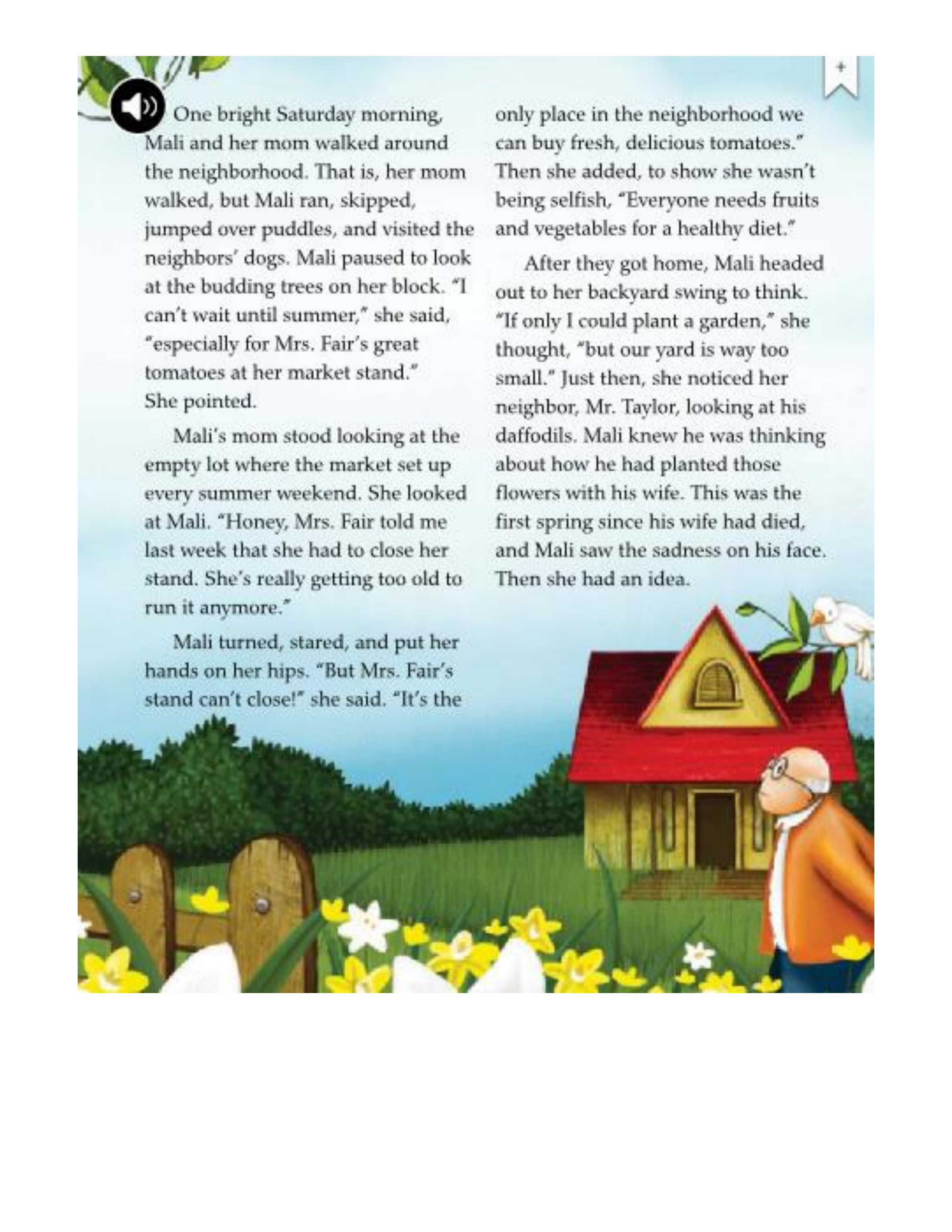 "Mali turned, stared, and put her hands on her hips. 'But Mrs. Fair's stand can't close!' she said. 'It's the only place in the neighborhood we can buy fresh, delicious tomatoes.' "