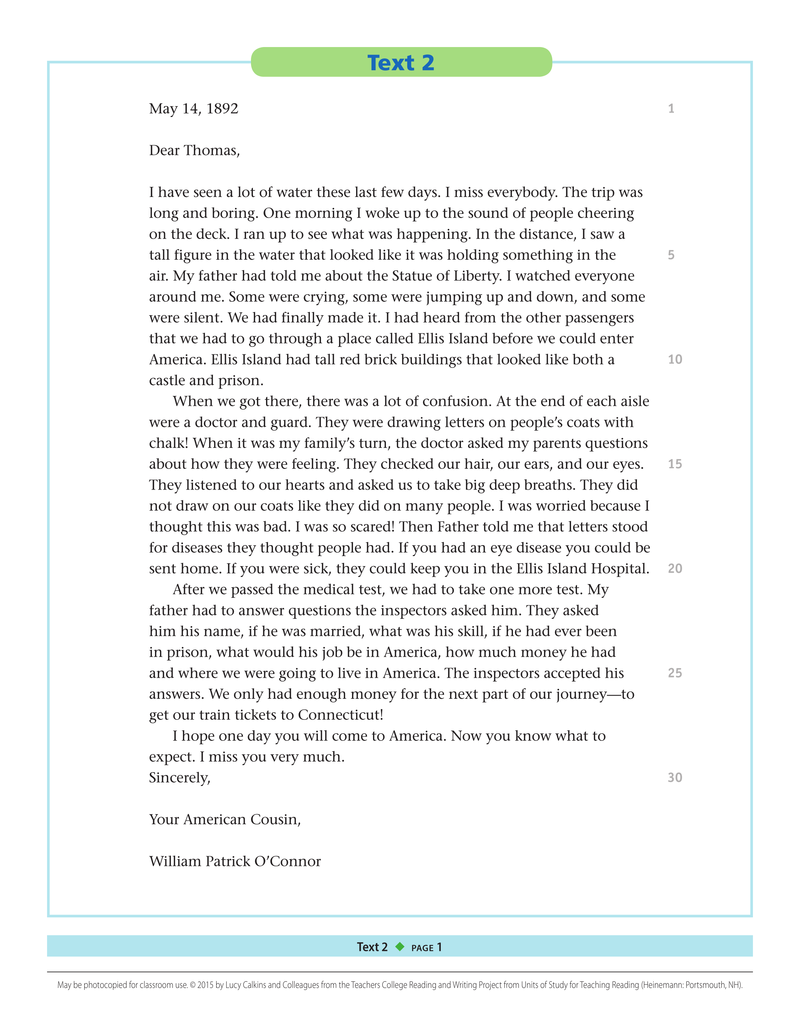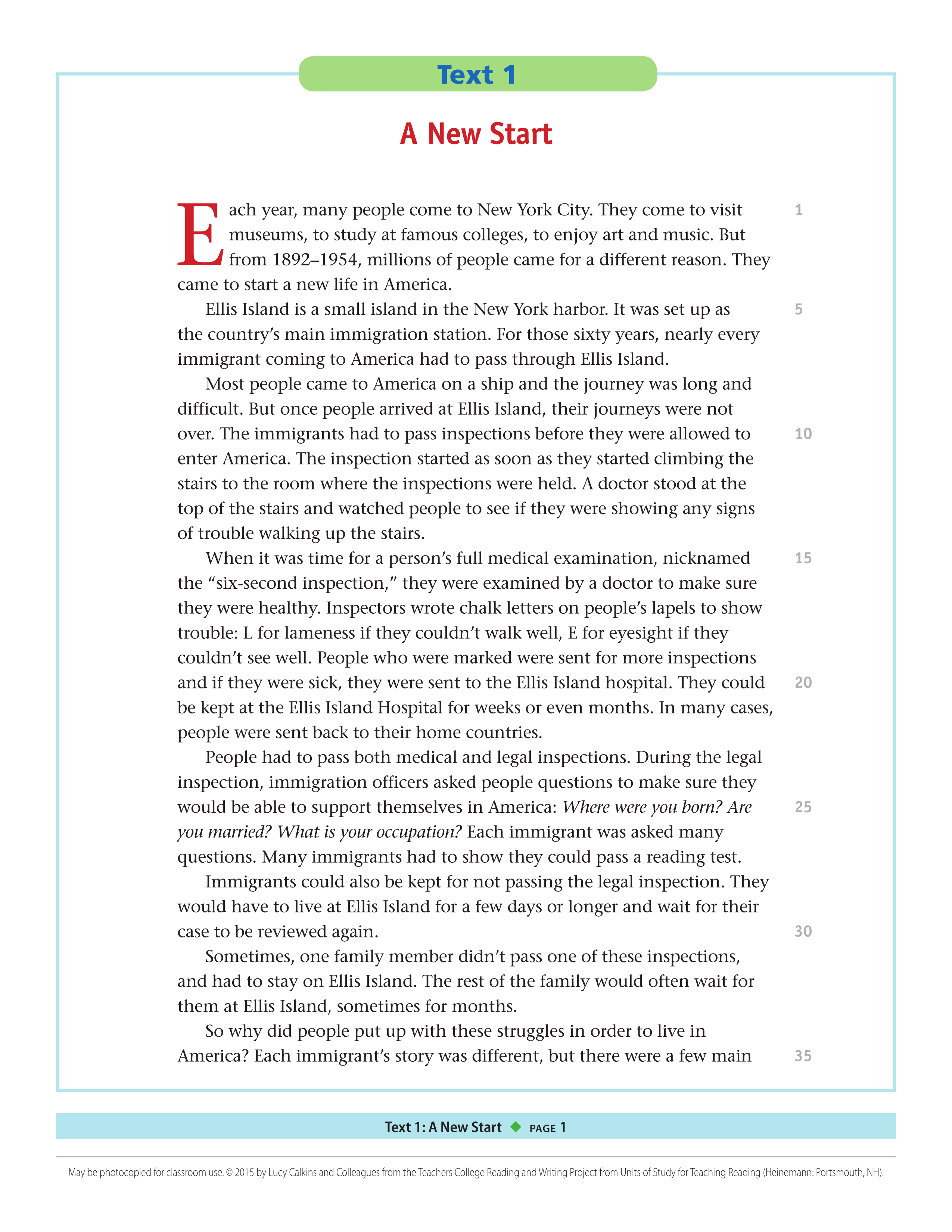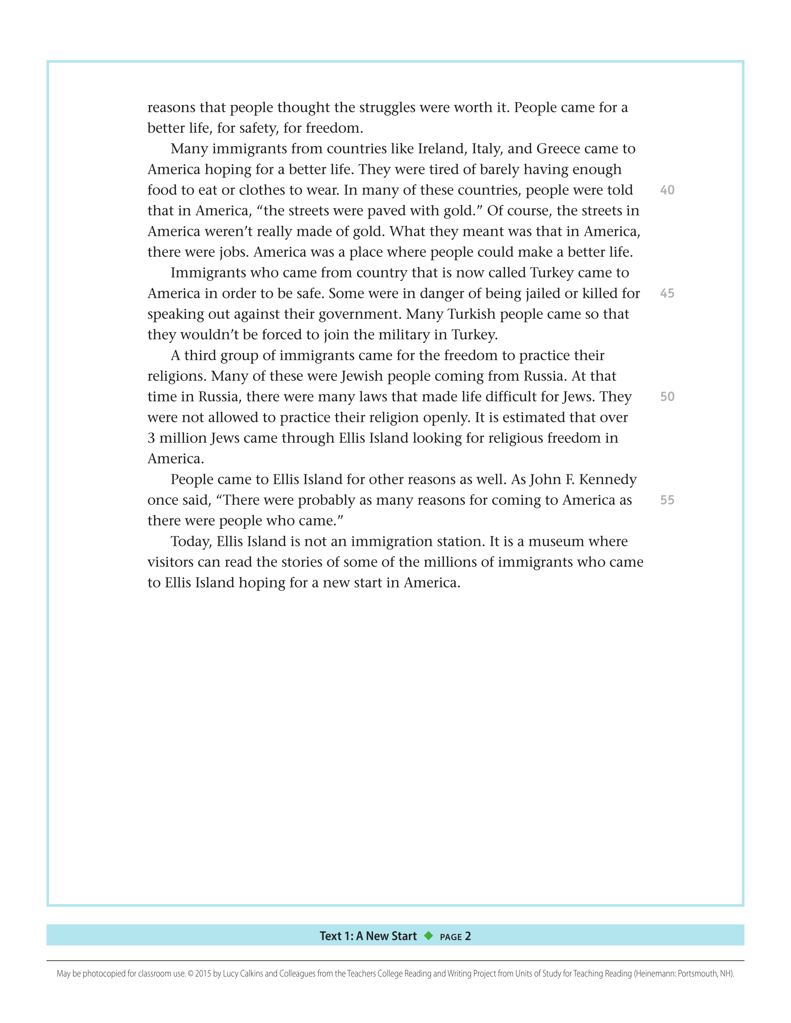 2. In “A New Start,” notice line 54, near the end of the text: As John F. Kennedy once said, “There were probably as many reasons for coming to America as there were people who came.” In a few sentences, explain how this part fits with the four paragraphs that come before it in the text. When writing about how part(s) of a text fit with others, remember to: • explain why the part is important • explain how the part fits with the rest of the text.