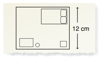 The actual length of his bedroom is 9m (or 900cm). What is the length of the bedroom in his drawing?