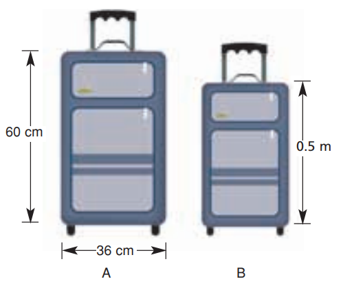 These suitcases have the same length-to-width ratio. Calculate the width of suitcase B. (0.5m = 50cm)