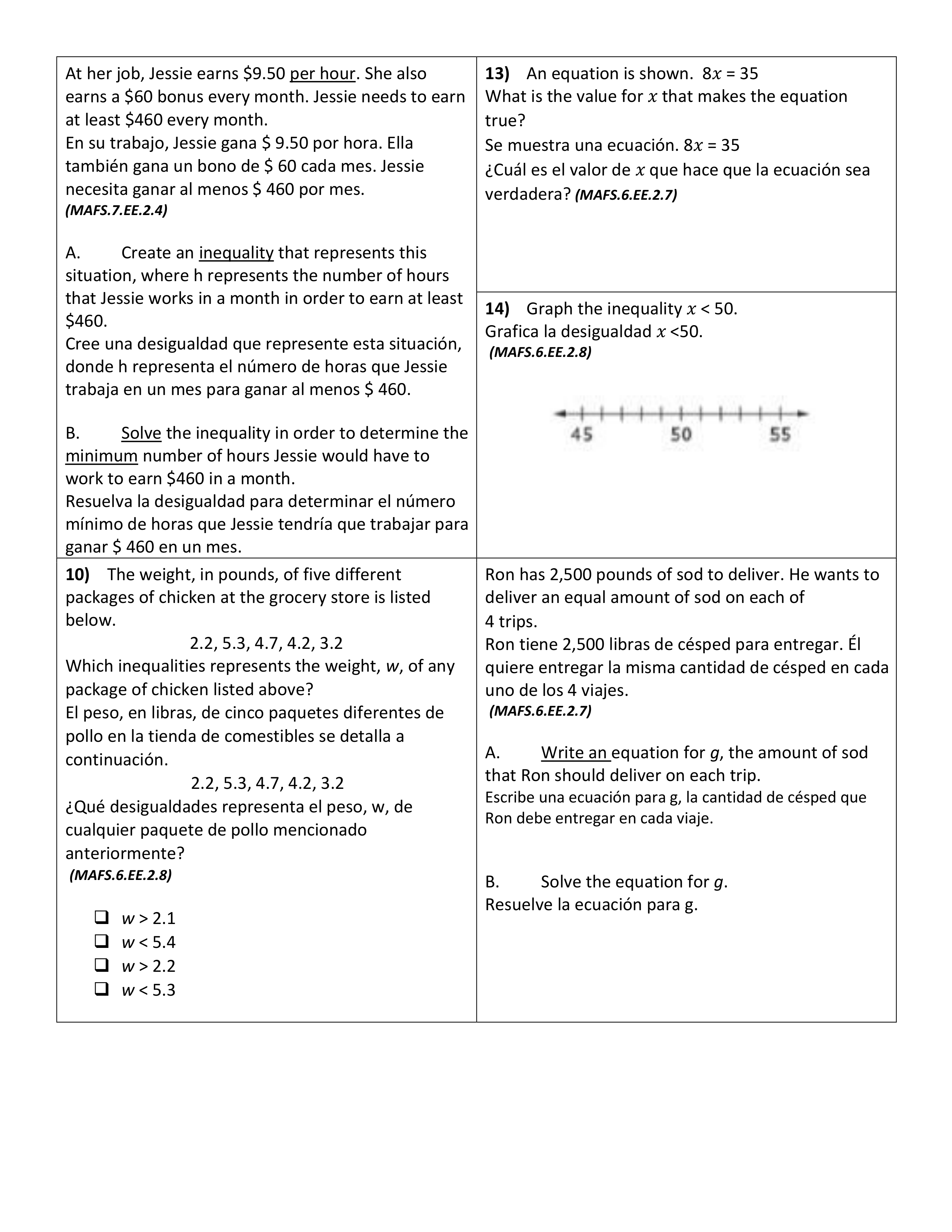 Be sure to show the solution to the inequality you wrote for #11 here. The minimum number of hours Jessie must work.Asegúrese de mostrar la solución a la desigualdad que escribió para el # 11 aquí. La cantidad mínima de horas que Jessie debe trabajar.
