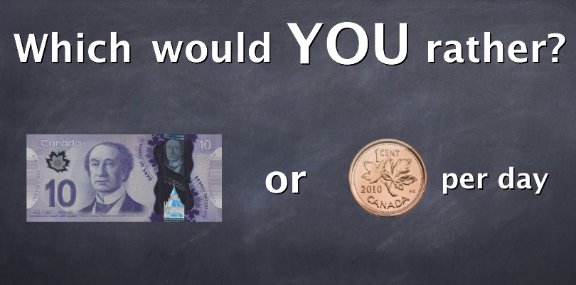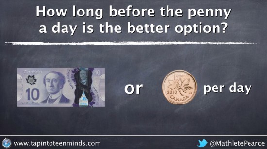 How long before the penny a day is the better option? Show your work below. Use EXPONENTS if you can.