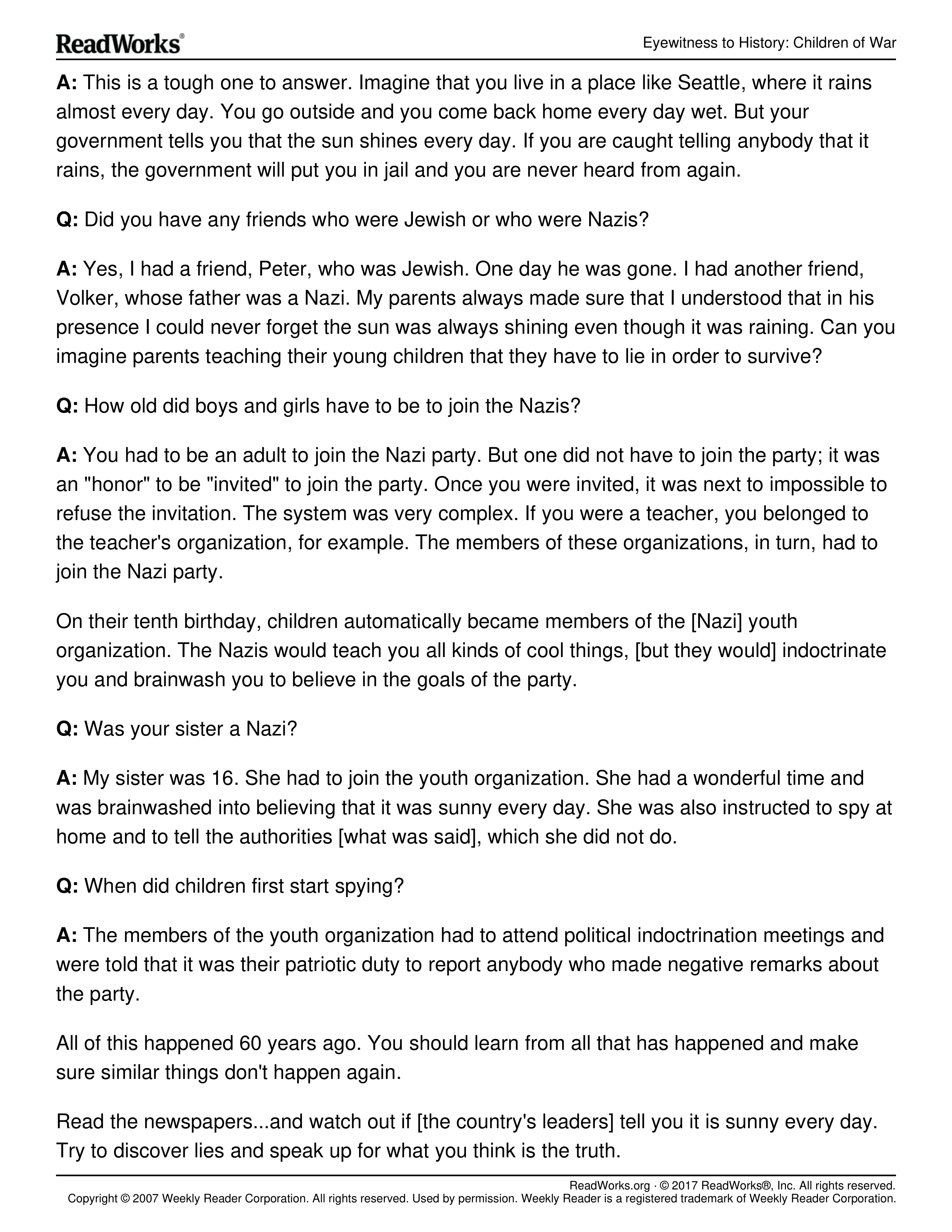When Hans is asked about his feelings regarding the Nazi party, he answers by comparing life under the Nazi Party to a different situation. What situation does Hans ask his interviewer, Will, to imagine?