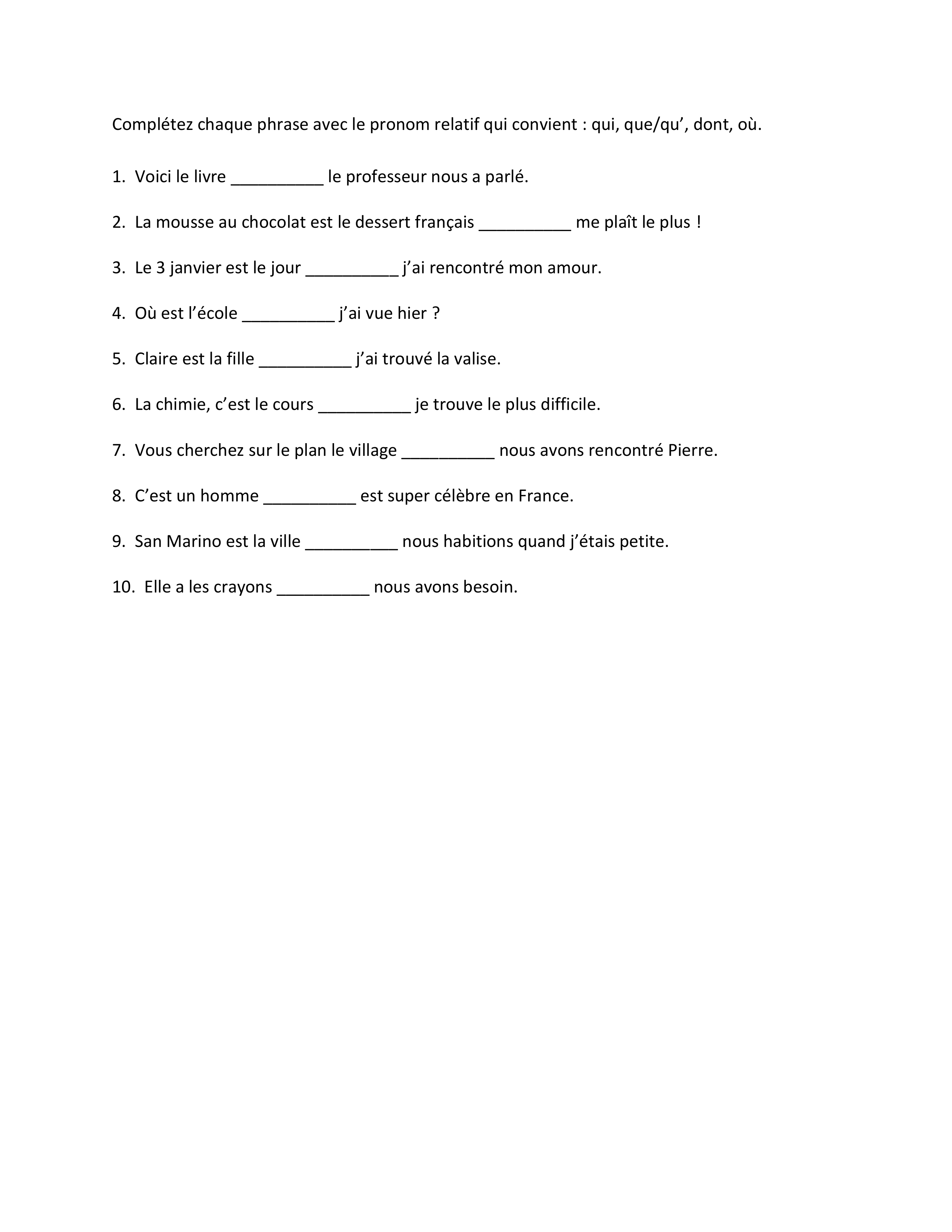 Pour les exercices suivants, mettez les deux propositions ensemble avec "dont" pour former une phrase.