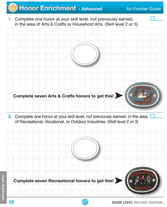 Complete one honor at your skill level, not previously earned, in the area of Arts & Crafts or Household Arts. (Skill level 2 or 3)