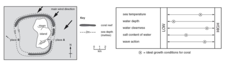 Using the figures above suggest reasons why coral would not grow at place B.