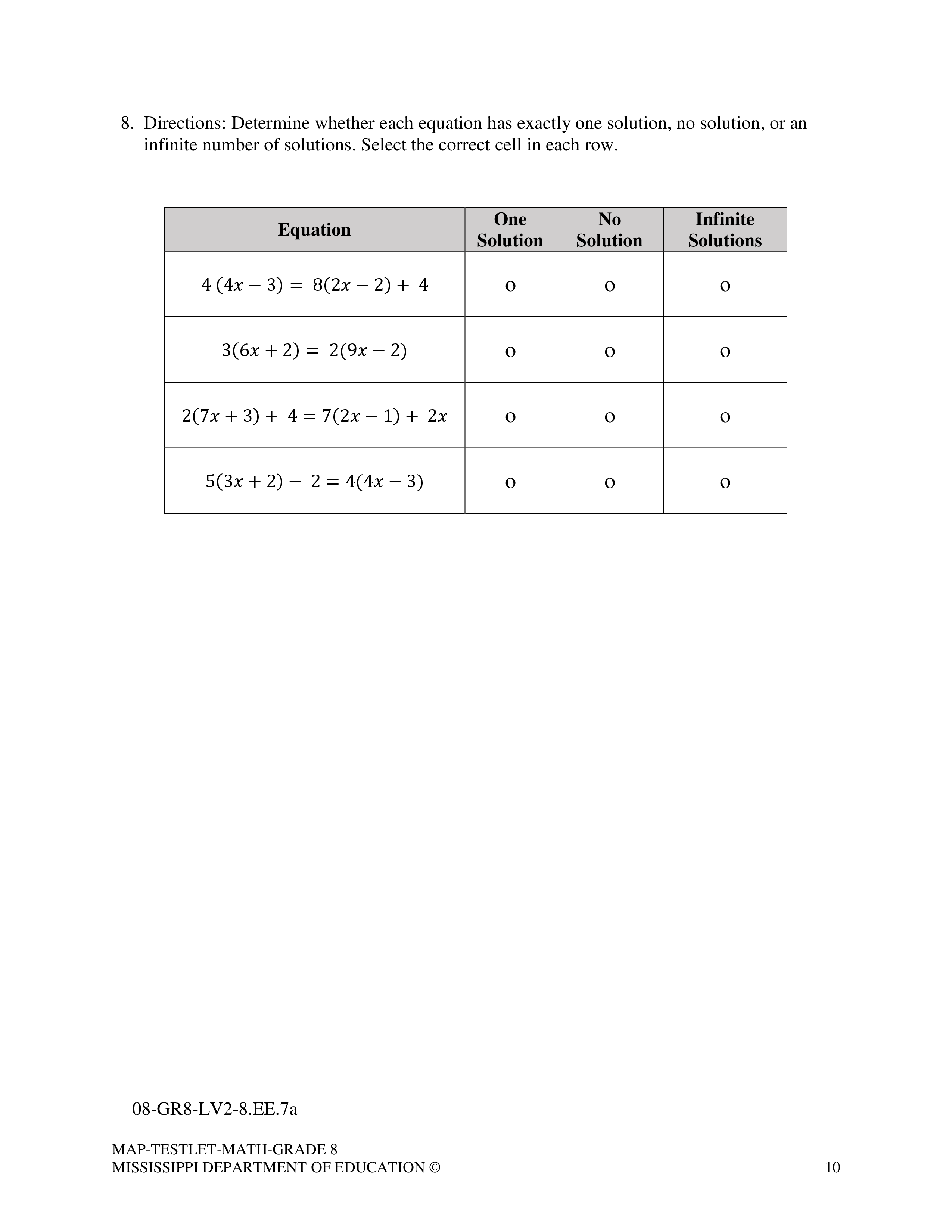 (8.EE.7a)Determine whether the equation has exactly one solution, no solution, or an infinite number of solutions.3(6x + 2) = 2(9x - 2)