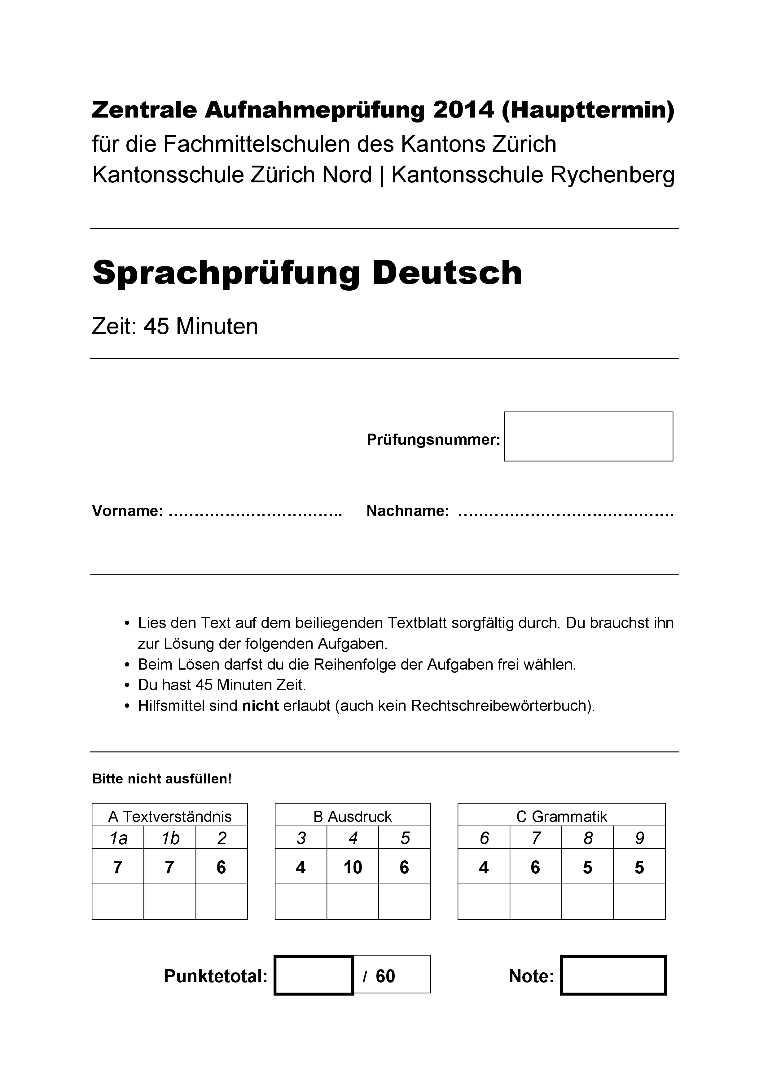 Zentrale Aufnahmeprüfung 2014 für die Fachmittelschulen des Kantons Zürich